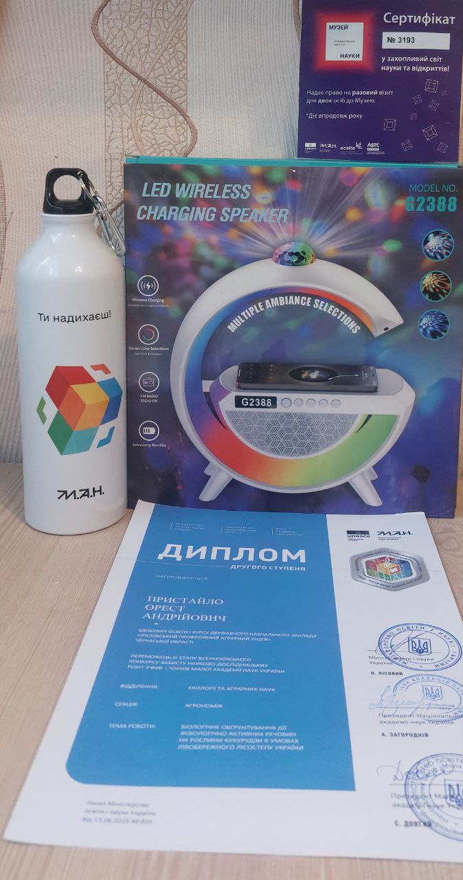 Диплом ІІ ступеня за підписом Оксена Лісового отримав здобувач освіти ДНЗ "Іркліївський ПАЛ" Орест Пристайло за перемогу в ІІІ етапі науково-дослідницьких робіт Малої академії наук України. Приємним сюрпризом було отримання також подарунків від МАНУ. Вітаємо Ореста. Пишаємося його здобутками. Бажаємо нових перемог!