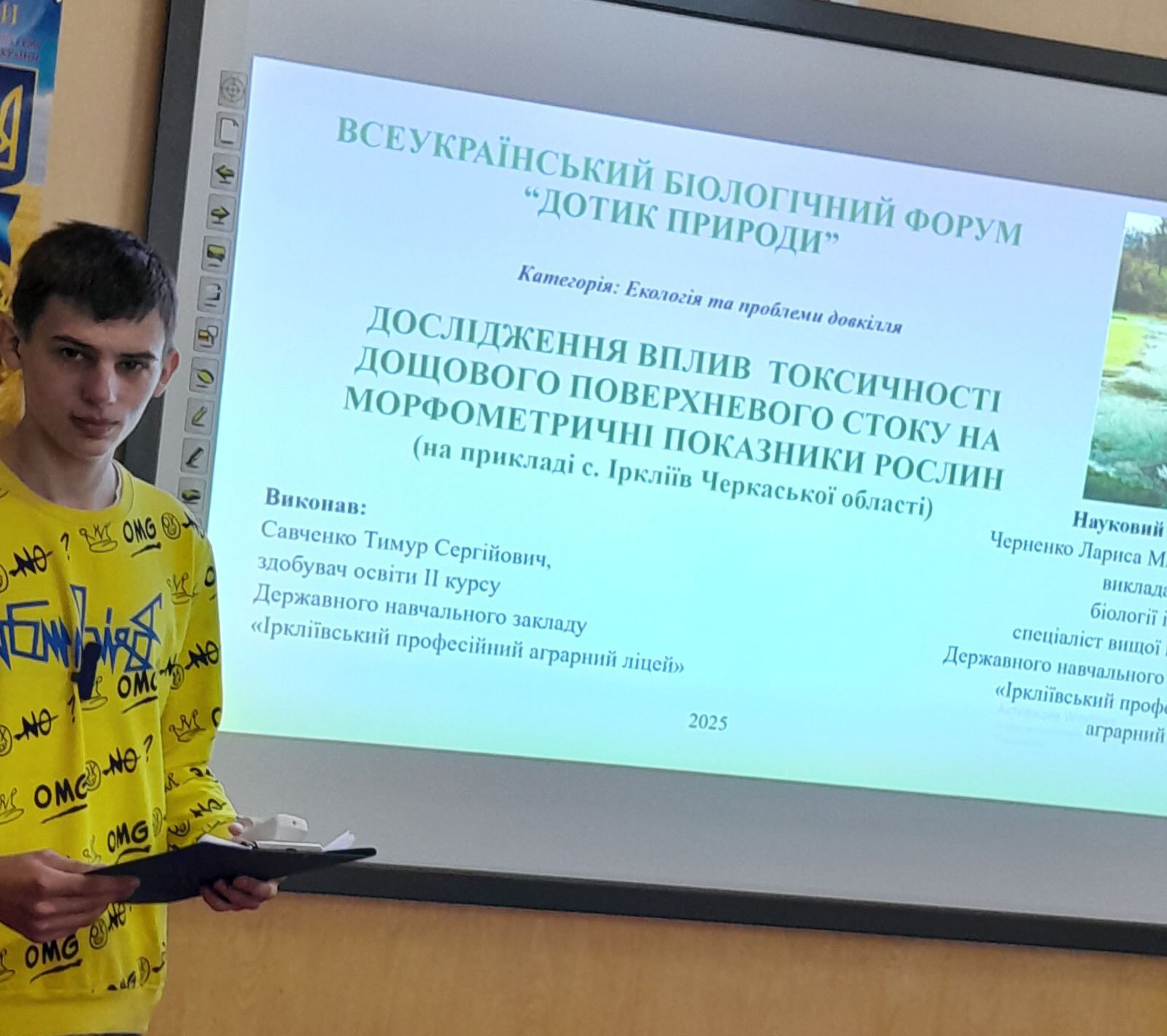 Здобувач освіти ІІ курсу Тимур Савченко став срібним призером Всеукраїнського біологічного форуму учнівської та студентської молоді «Дотик природи – 2025». Його науково-дослідницький проєкт «Дослідження впливу токсичності дощового поверхневого стоку на морфометричні показники рослин (на прикладі с. Іркліїв Черкаської області)» в категорії «Екологія та проблеми довкілля» був високо відзначений журі.