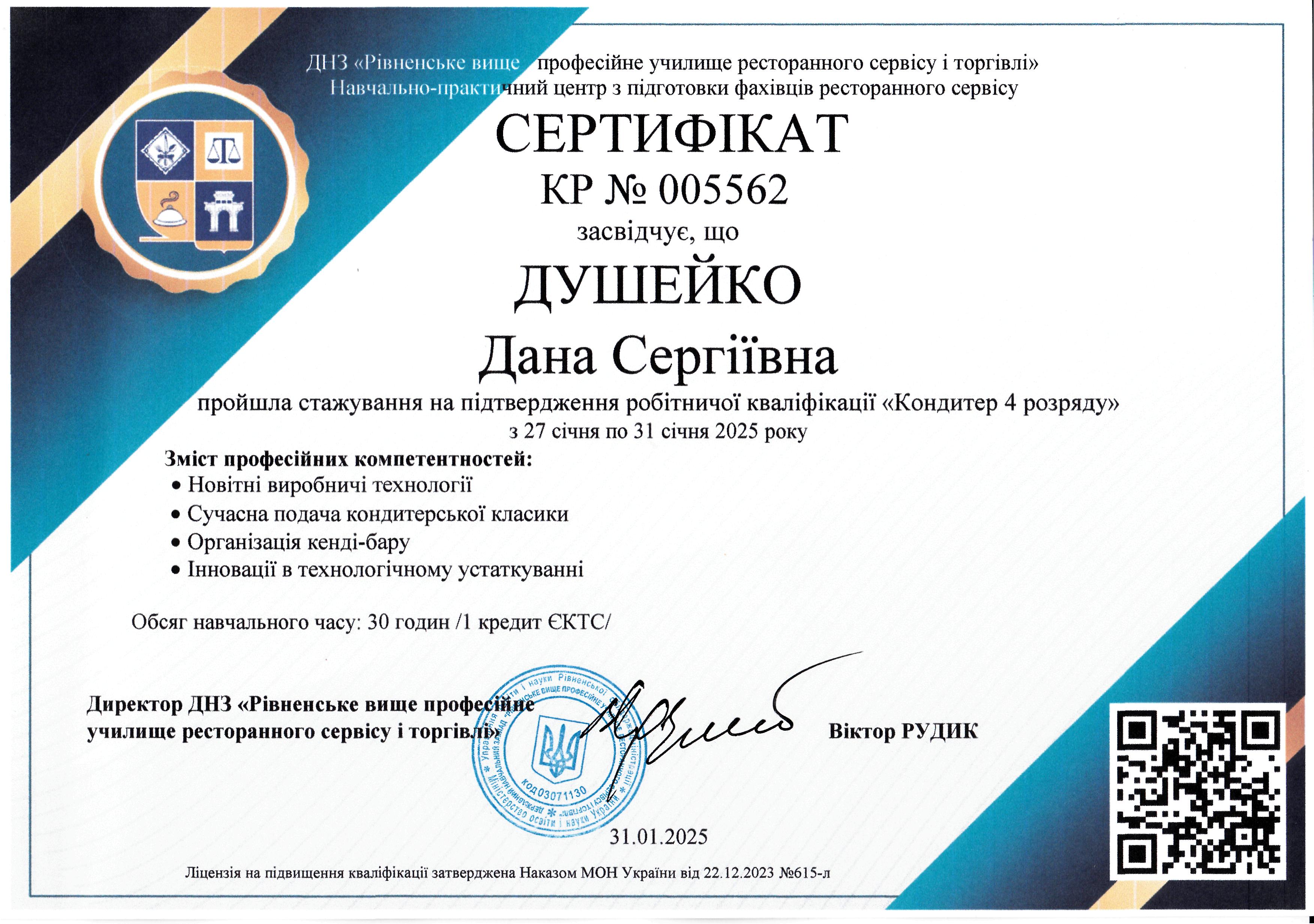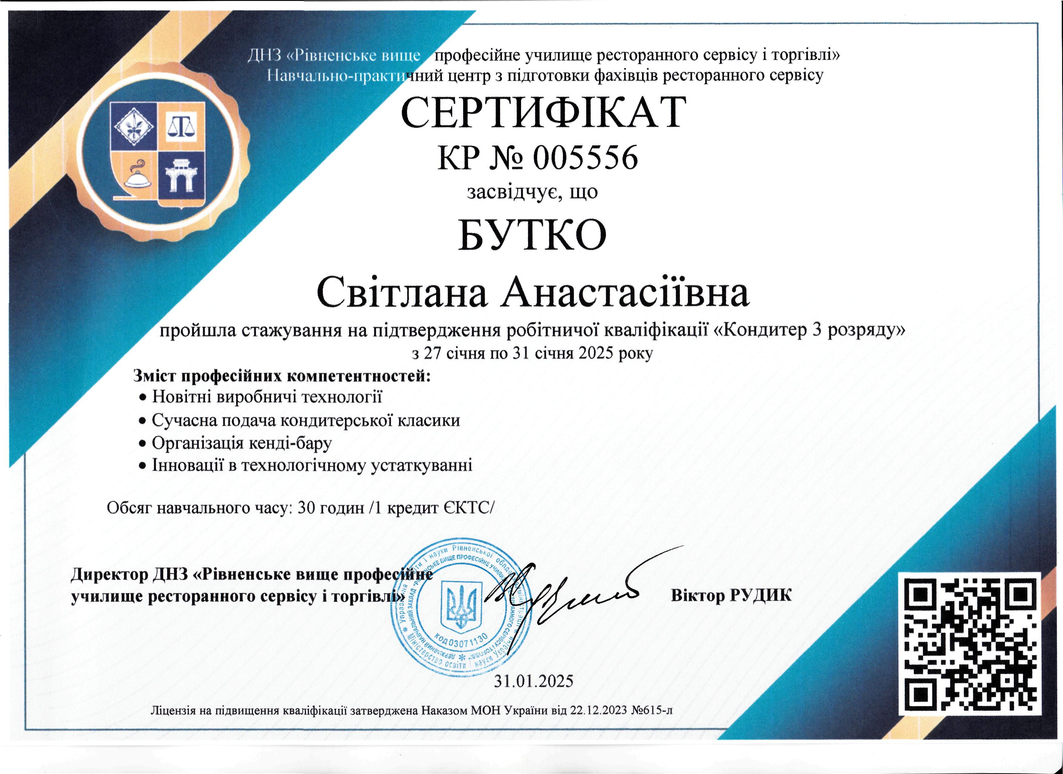 З 27.01-31.01.25 р на базі ДНЗ «Рівненське ВПУ ресторанного сервісу і торгівлі» пройшло стажування з професії «Кондитер» в онлайн форматі. Майстри виробничого навчання Душейко Д.С. та Бутко С.А. вдало пройшли стажування та отримали сертифікати.