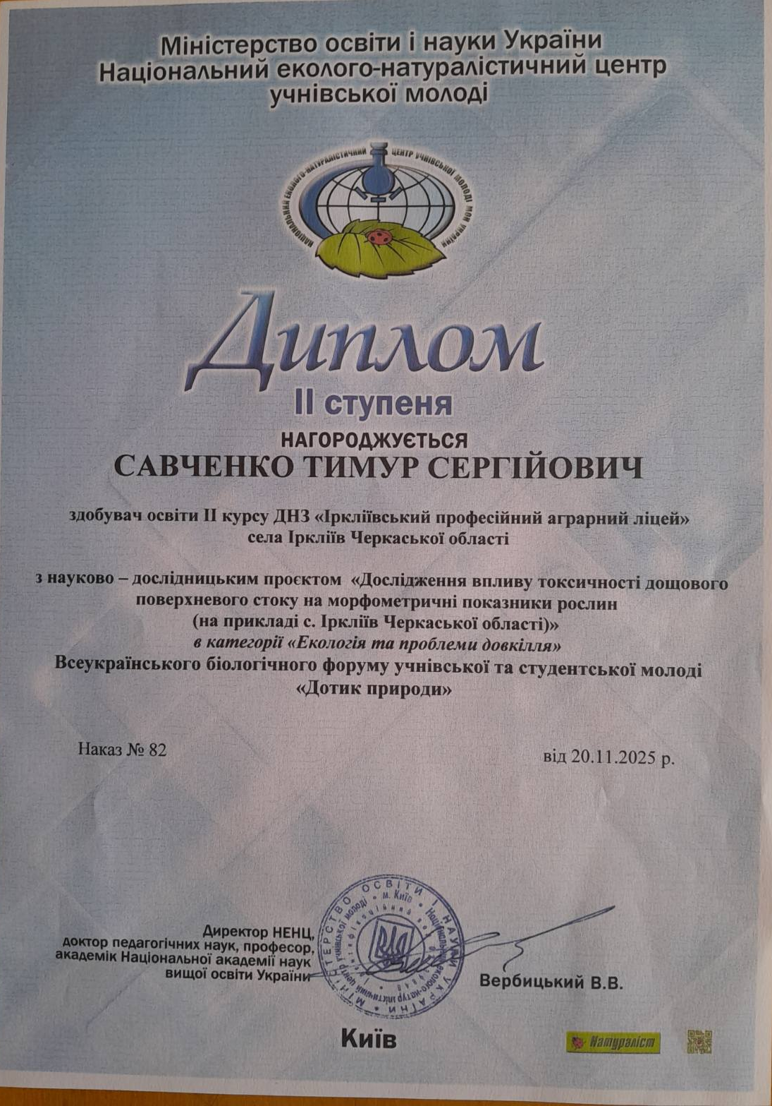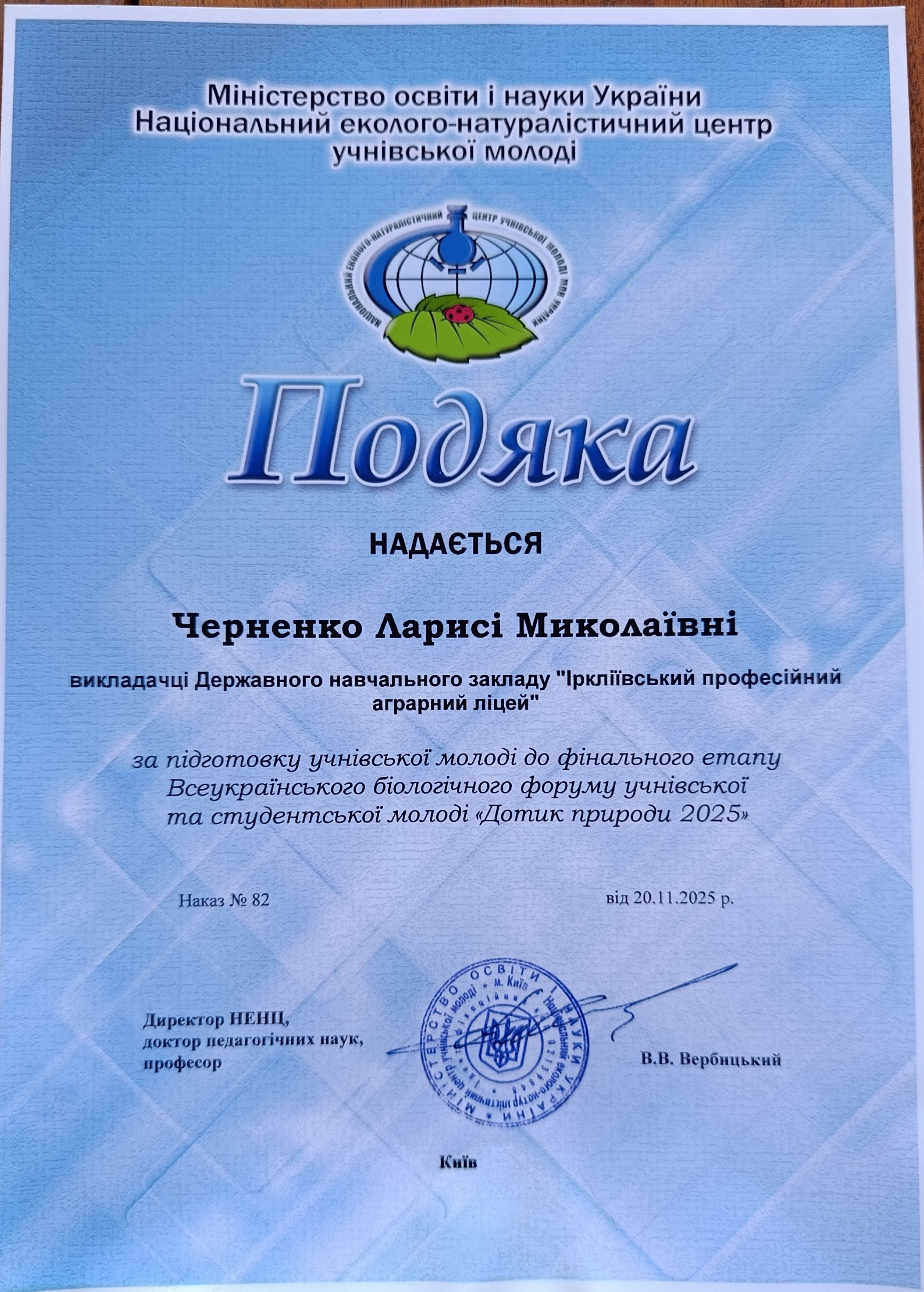 Викладачка ДНЗ «Іркліївський професійний аграрний ліцей» Лариса Миколаївна Черненко отримала подяку від Національного еколого-натуралістичного центру учнівської молоді за підготовку фіналіста Всеукраїнського біологічного форуму учнівської та студентської молоді «Дотик природи 2025» Тимура Савченка.