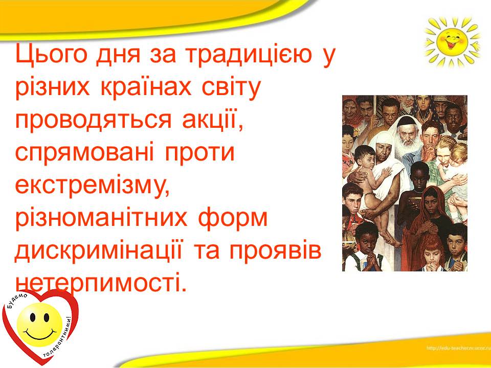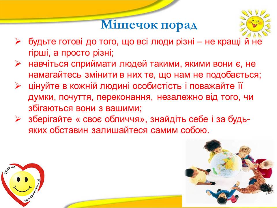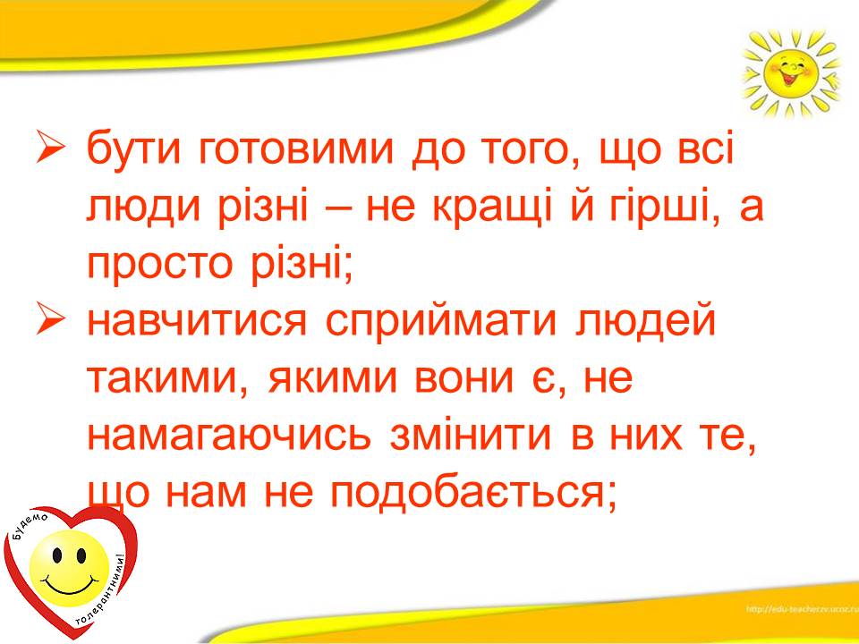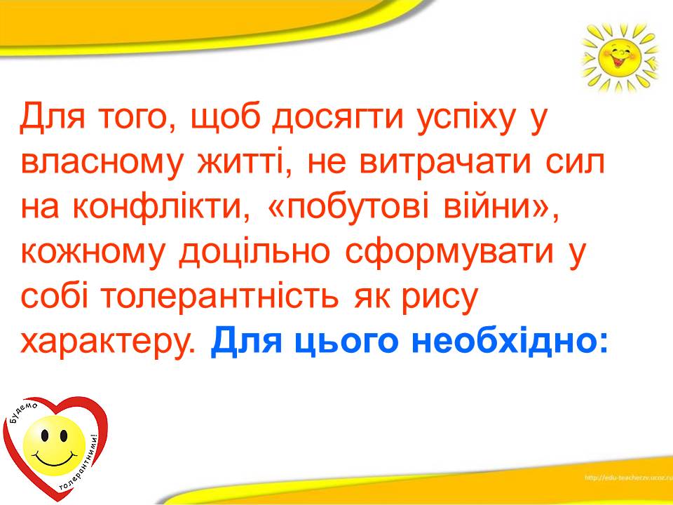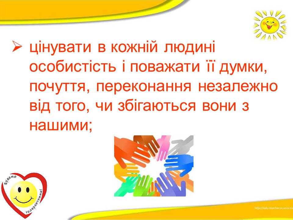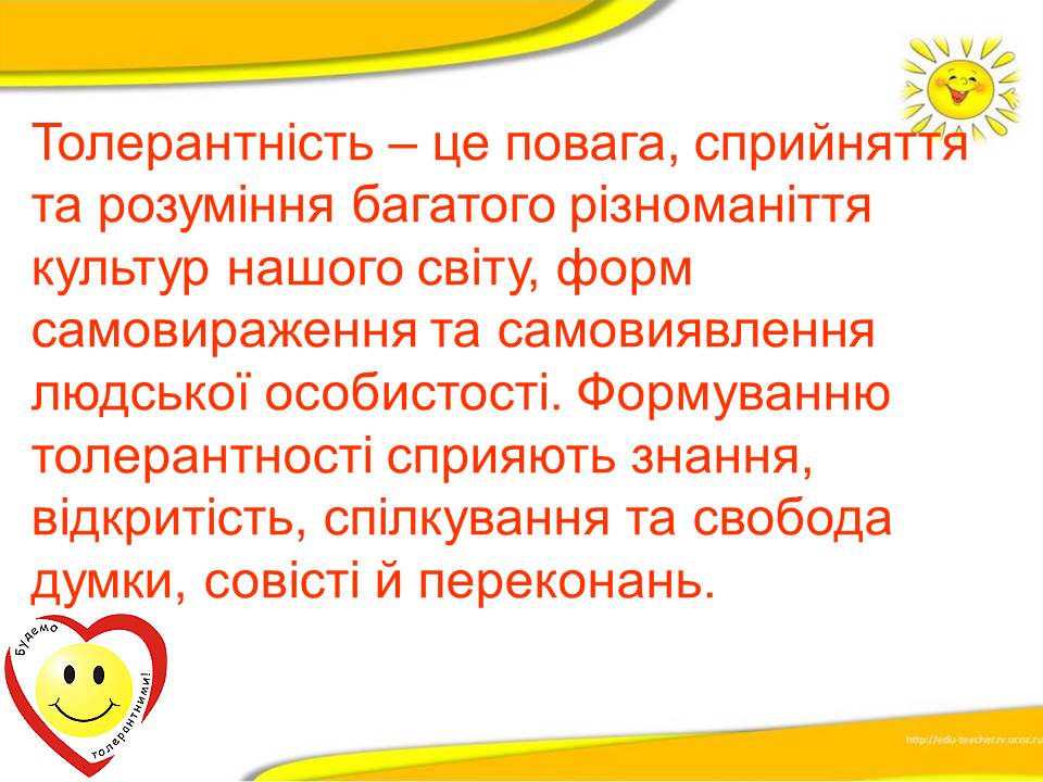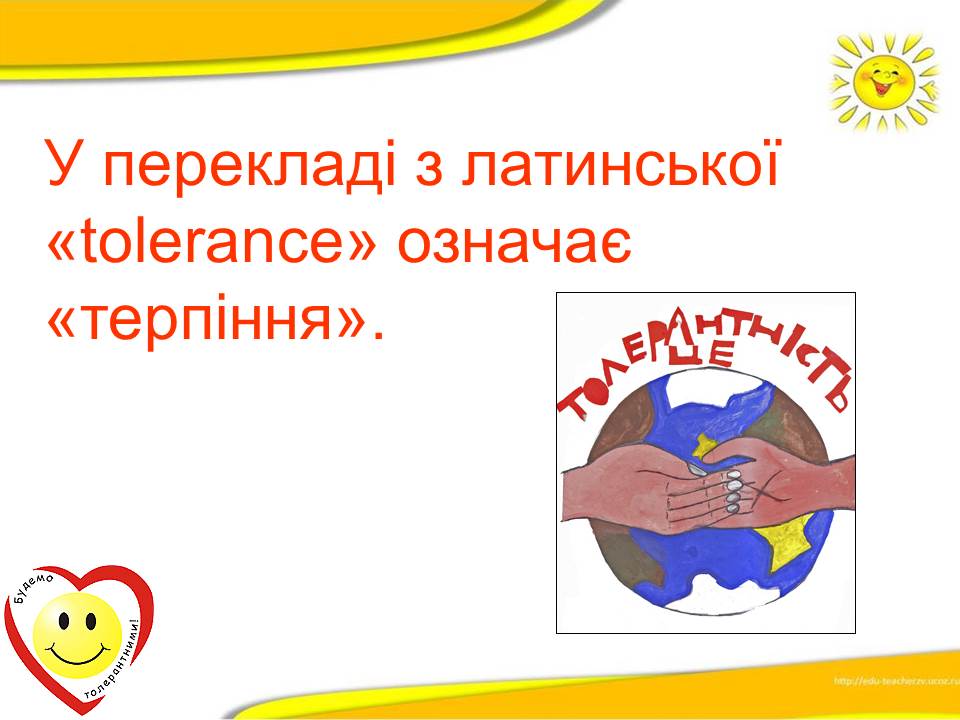 Варто пам'ятати, що толерантність ‒ це терпимість до іншого світогляду, способу життя, поведінки, культури і звичаїв.