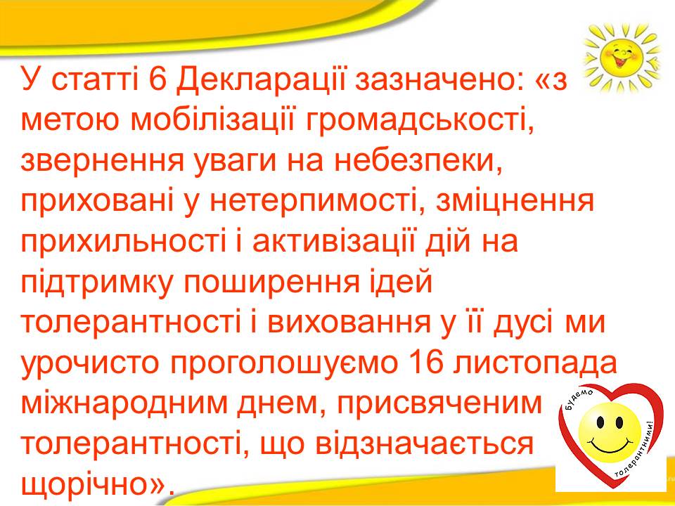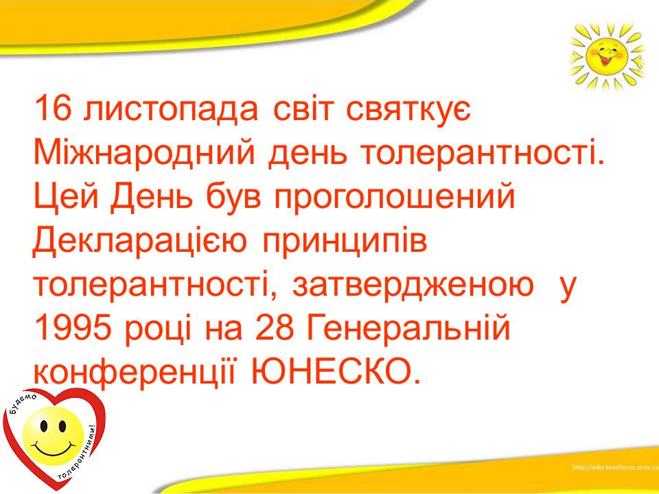 Ухвалення 16 листопада 1995 року Декларації принципів терпимості, поклало початок відзначенню у всьому світі Міжнародного дня толерантності.