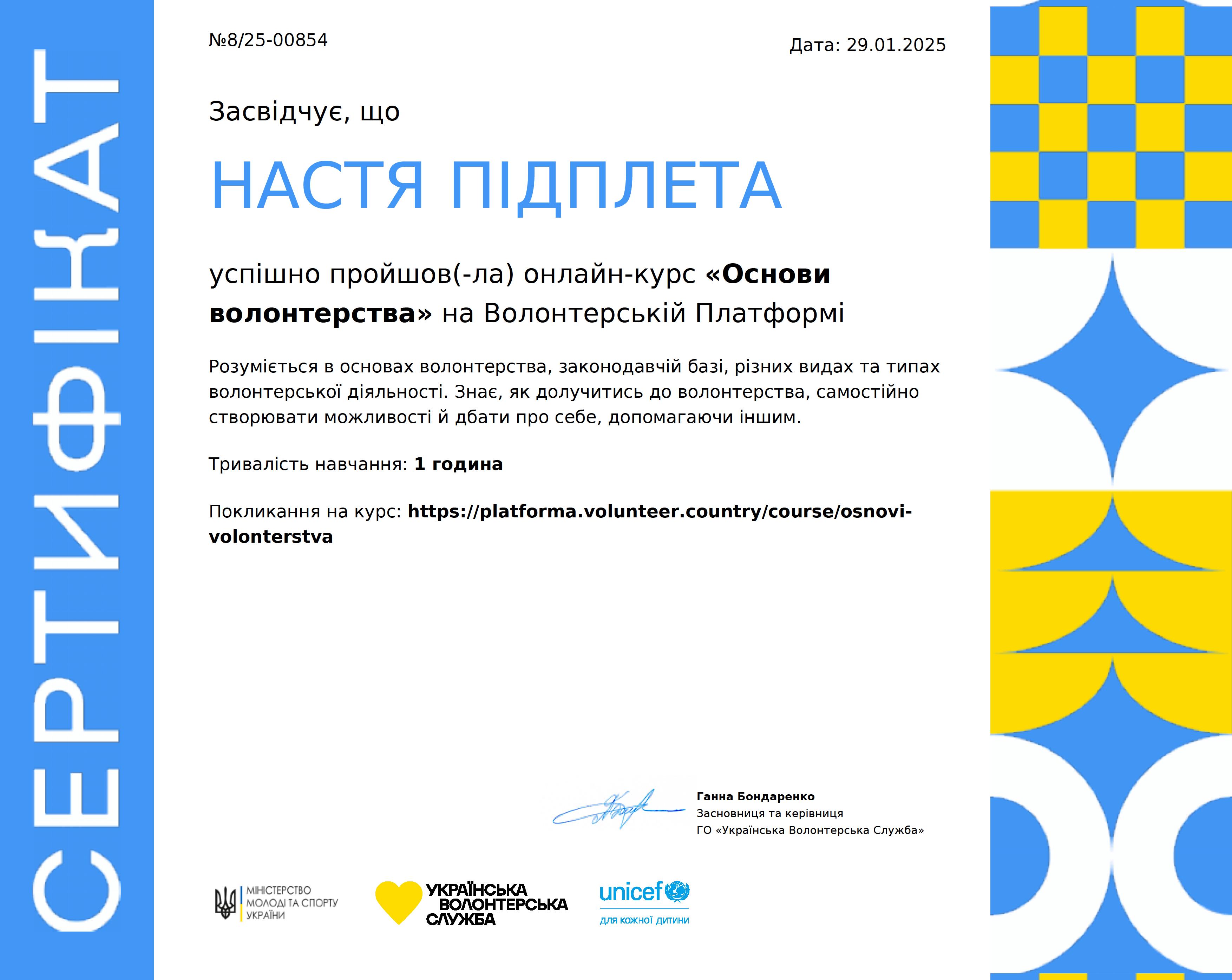 Актив волонтерського хабу – Анастасія Підплета, Юрій Вовк та Олег Тищук – проходять навчання на Волонтерській Платформі ГО «Українська Волонтерська Служба» за підтримки Міністерства молоді та спорту України та вже мають перші сертифікати.