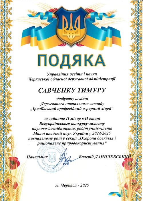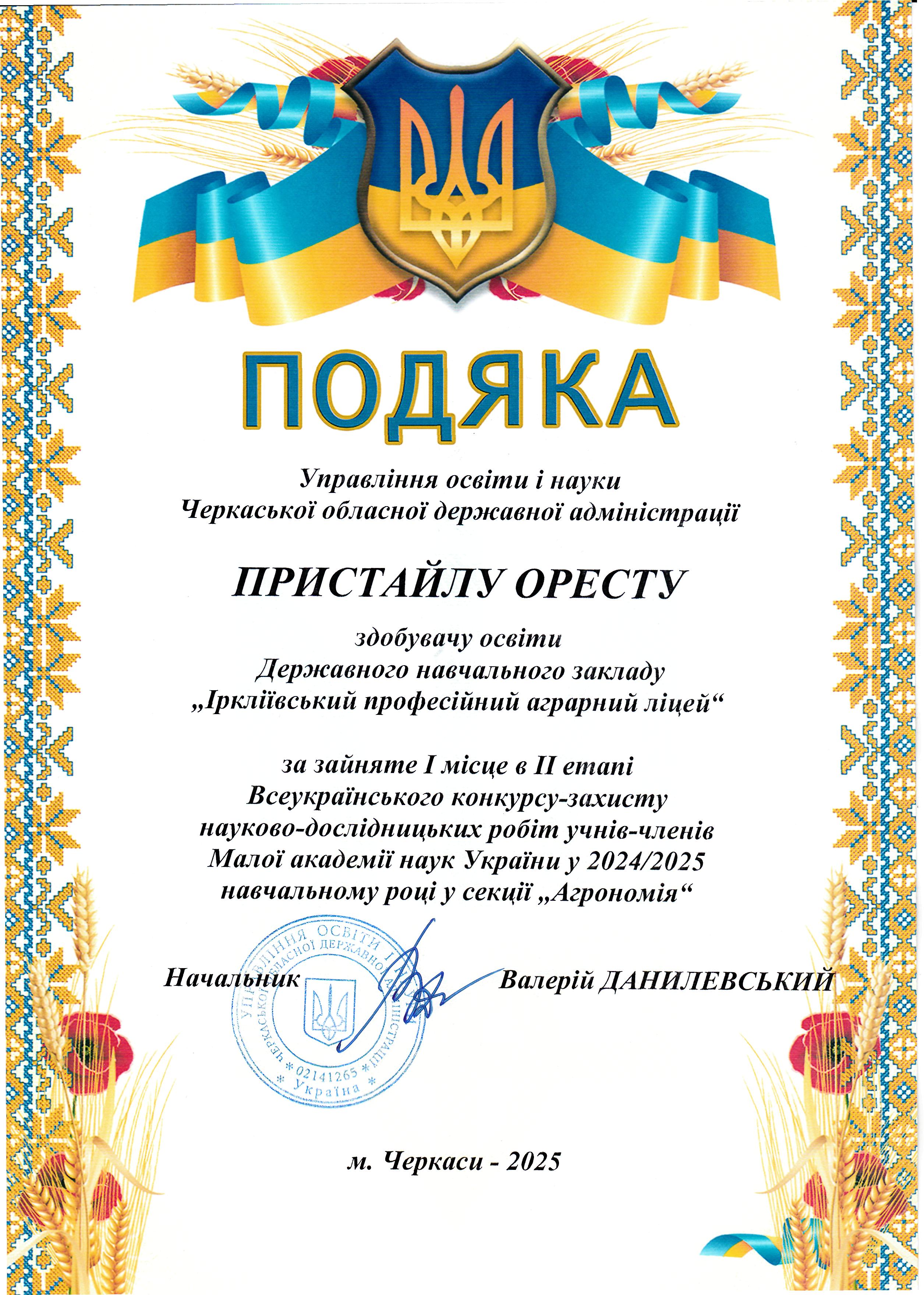 Подяками від Управління освіти і науки Черкаської обласної держадміністрації нагороджено здобувачів освіти Державного навчального закладу «Іркліївський аграрний ліцей» Ореста Пристайла за І місце в ІІ етапі Всеукраїнського конкурсу-захисту науково-дослідницьких робіт Малої академії наук України (секція «Агрономія») та Тимура Савченка за ІІ місце (секція «Охорона довкілля та раціональне природокористування»).