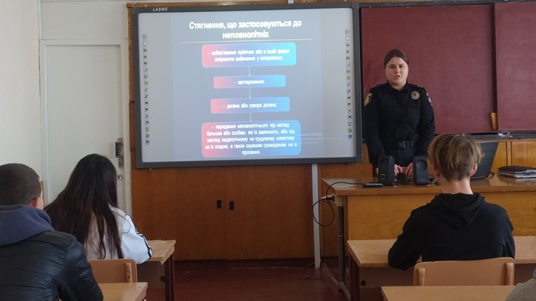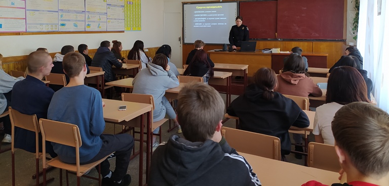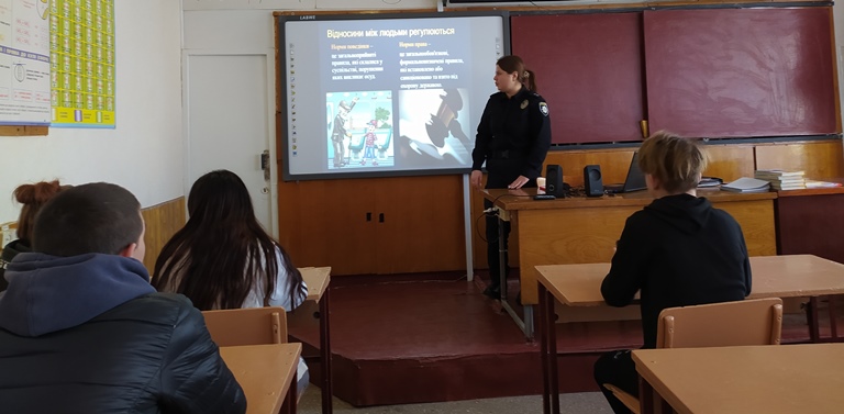 На зустрічі були підняті питання про права та обов’язки здобувачів освіти, про адміністративну відповідальність за вживання тютюну та алкоголю неповнолітніми та відповідальність за це їхніх батьків, про протидію булінгу та попередження будь-яких проявів насильства. Окремо було приділено увагу питанню протидії втягування неповнолітніх у диверсійну діяльність.