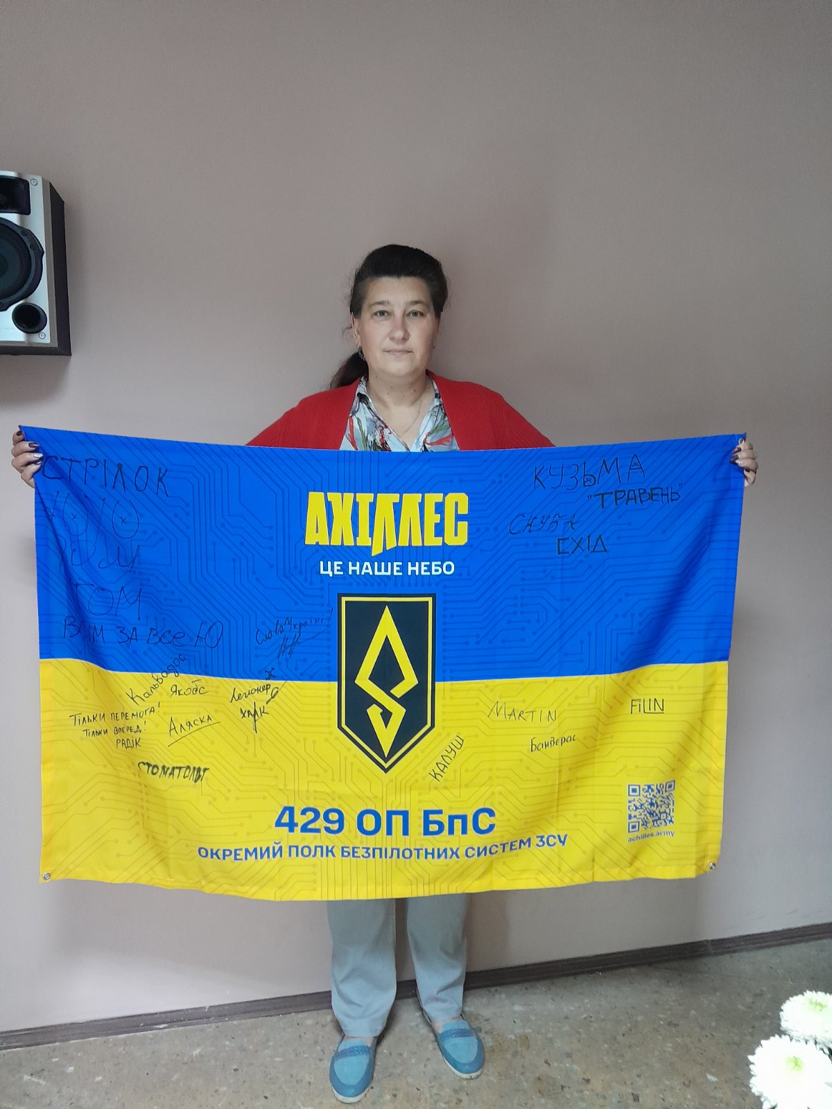 Нещодавно здобувачі освіти та працівники Державного навчального закладу «Іркліївський професійний аграрний ліцей» отримали від 429 окремого полку безпілотних систем «Ахіллес» подарунок – прапор з емблемою полку та підписами і побажаннями військових.
