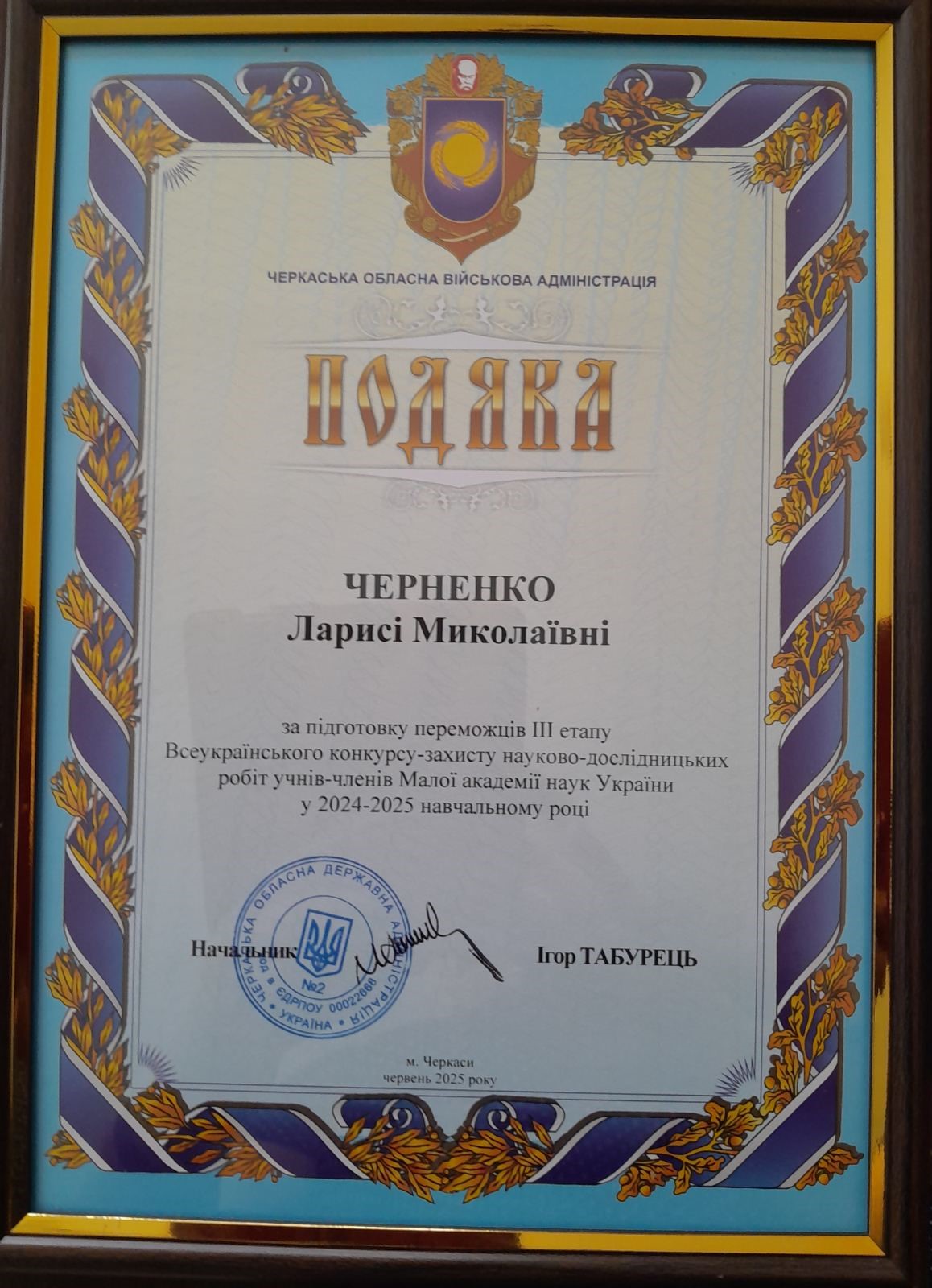 Лариса Миколаївна отримала подяку від голови Черкаської обласної військової адміністрації Ігоря Табурця.