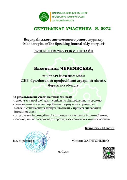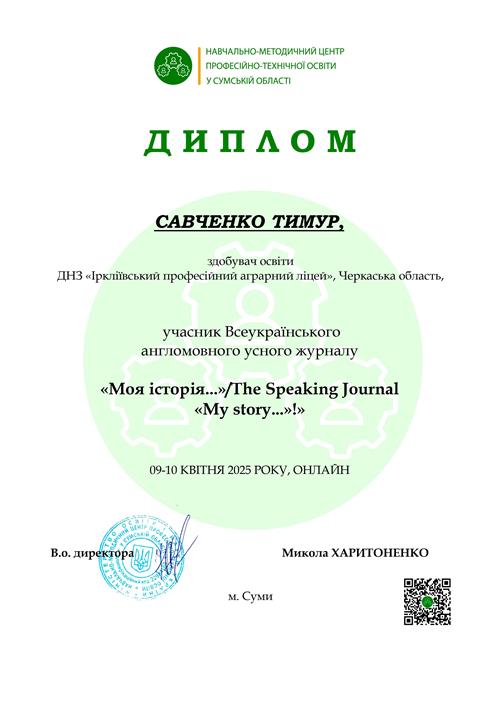 9-10 квітня відбувся захід, ініційований навчально-методичним центром професійно-технічної освіти у Сумській області Всеукраїнський англомовний журнал «Моя історія…». У ньому взяв участь здобувач освіти першого курсу Державного навчального закладу «Іркліївський професійний аграрний ліцей» Савченко Тимур, підготувавши виступ і презентацію на тему “My Future Profession” («Моя майбутня професія»). Було дуже цікаво і пізнавально долучитися до такої величезної аудиторії, вивчати вміння і досвід інших учасників і поділитись своїми. Тимур отримав цінний досвід і надалі так сама активно долучатиметься до подібних заходів, які розвивають професійні вміння і навички. Вітаємо нашого учасника.
