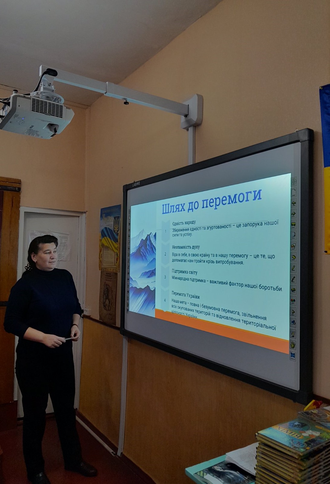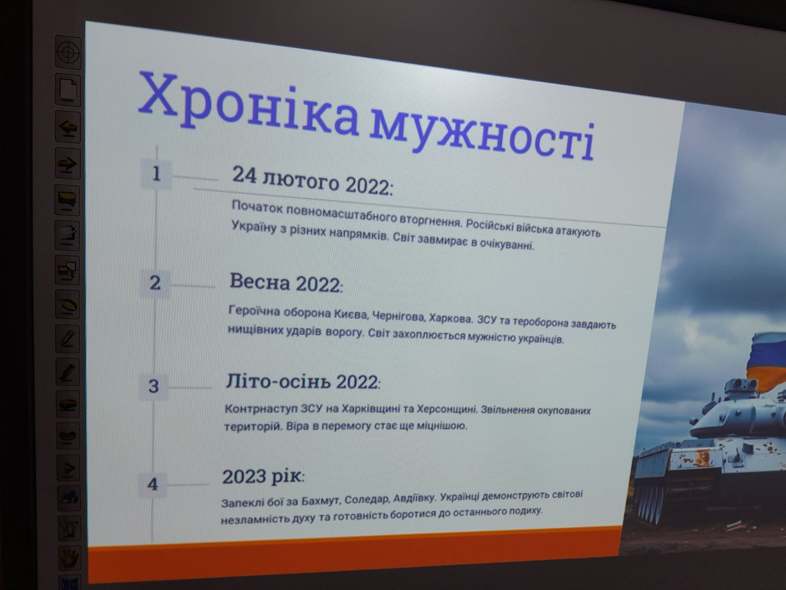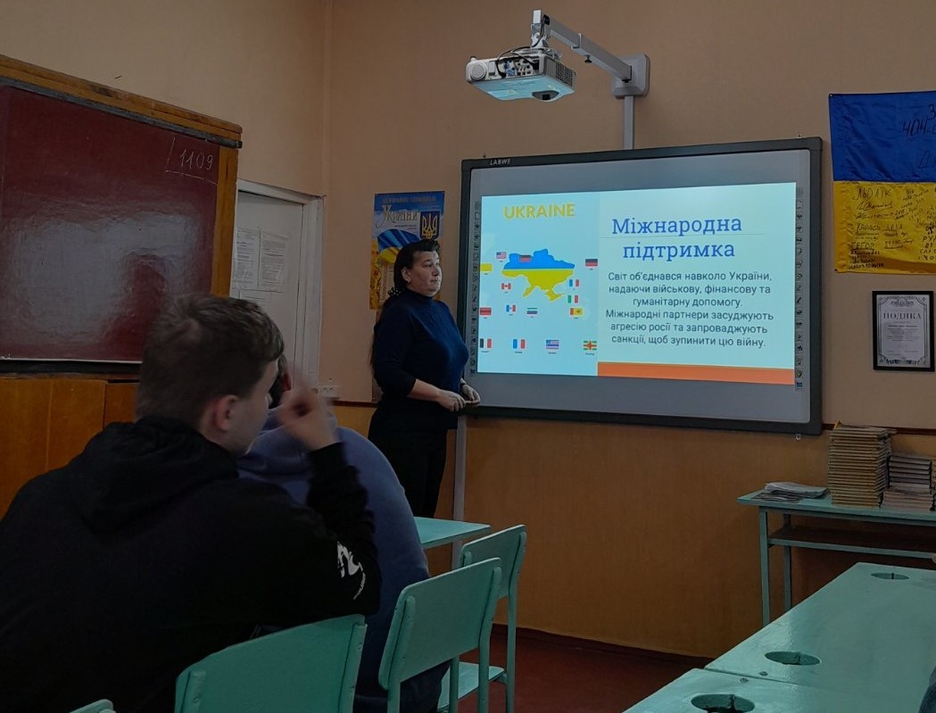 Викладачка разом із здобувачами освіти переглянули презентацію та обговорили основні моменти перебігу війни, відмітивши стійкість та мужність Захисників України, вкотре наголосивши на важливості будь-якої допомоги ЗСУ. Адже, крок за кроком, кожний із нас несе свою частинку до вівтаря спільної Перемоги. Разом ми все здолаємо.