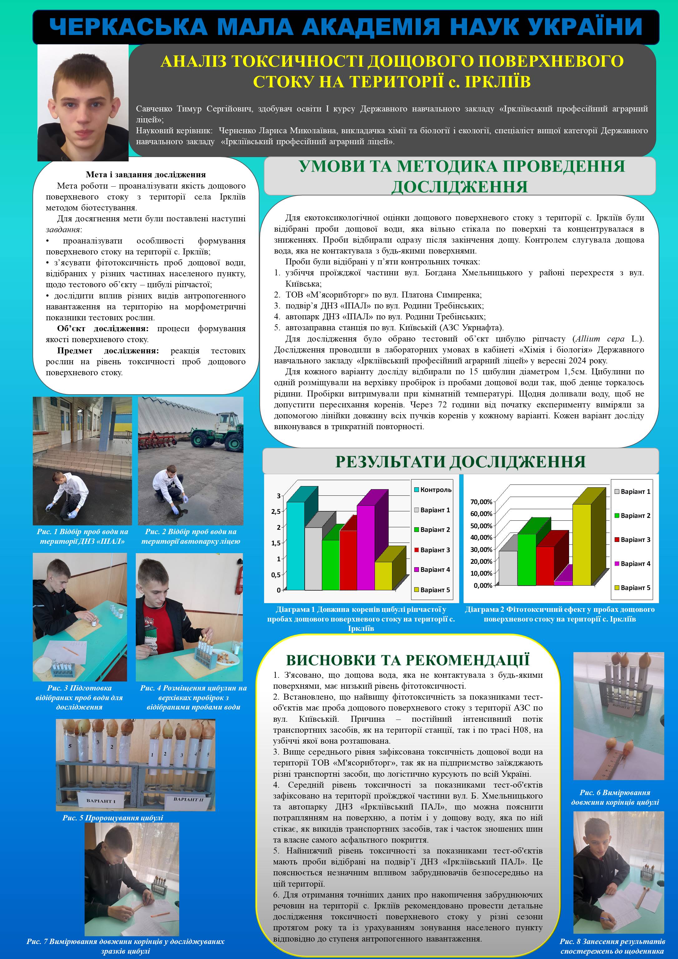 Тимур Савченко посів ІІ місце (перший результат) в секції «Охорона довкілля і раціональне природокористування» з роботою на тему «Аналіз токсичності дощового поверхневого стоку на території с. Іркліїв».