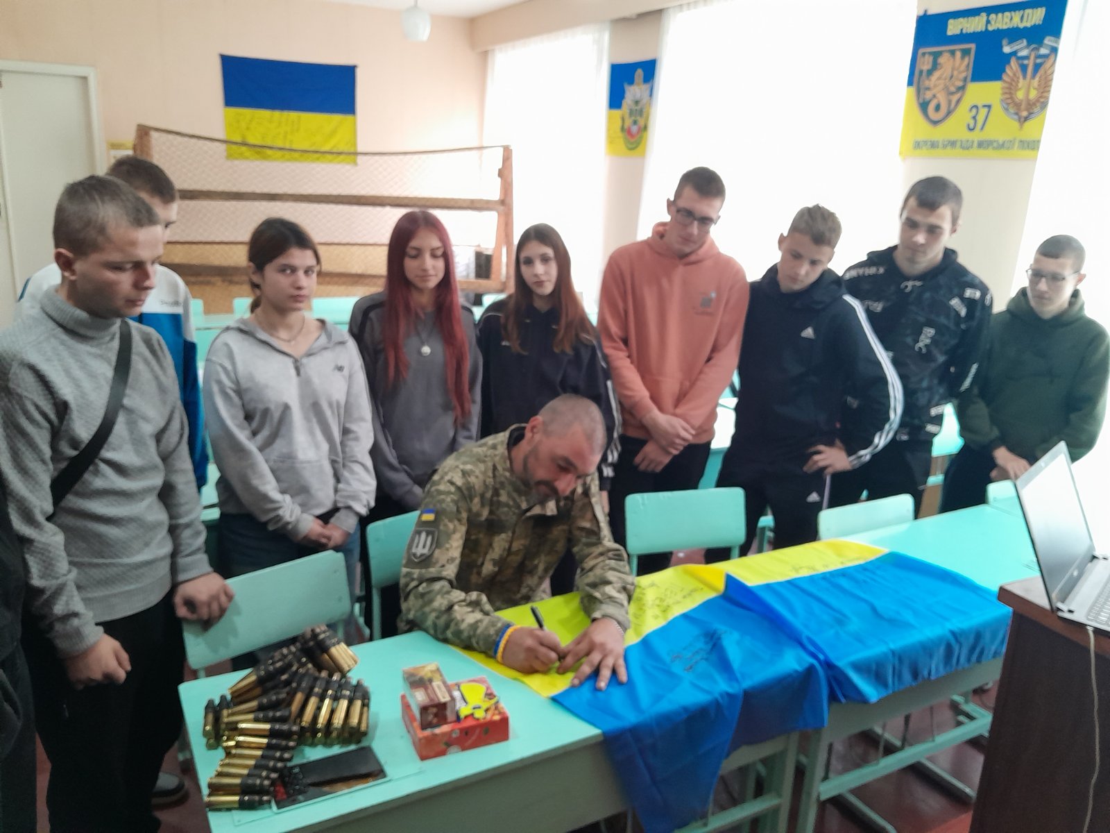 По закінченню зустрічі від здобувачів освіти ліцею Дмитро отримав обереги та смачні чаї. І, вже традиційно, на прапорі написав побажання «Разом до Перемоги!».