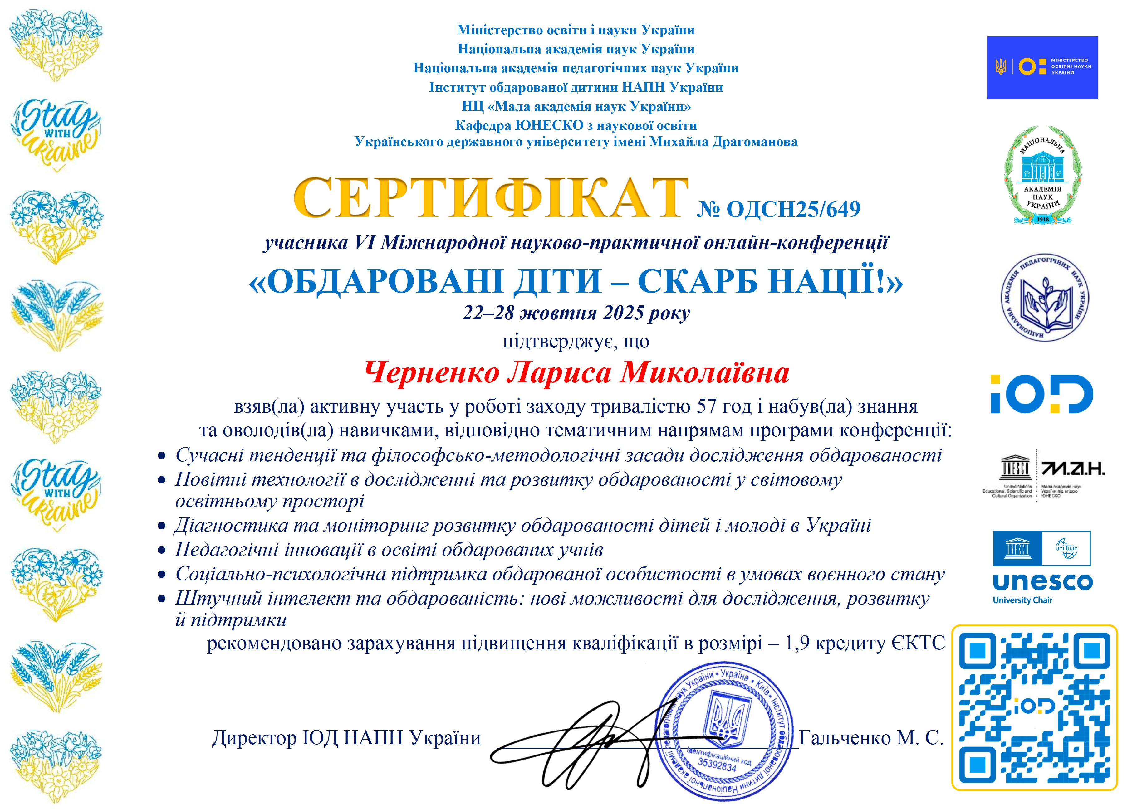 Викладачка природничих предметів Державного навчального закладу “Іркліївський професійний аграрний ліцей” Лариса Миколаївна Черненко взяла активну участь у VІ Міжнародній науково-практичній конференції “Обдаровані діти - скарб нації”, яка проходила в режимі онлайн із 22 по 28 жовтня 2025 року за підтримки МОН України.