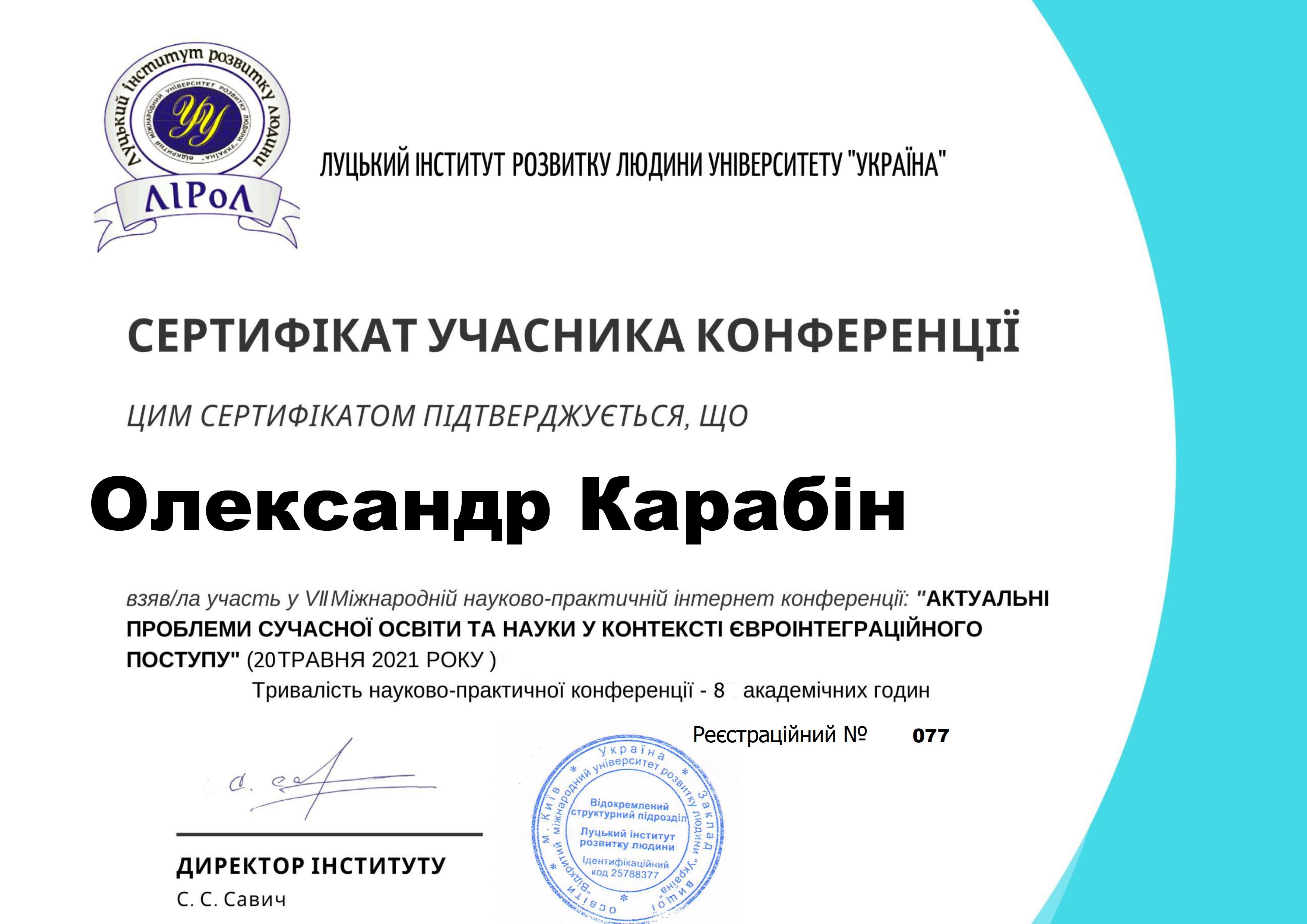 В.о. директора ДНЗ «Іркліївський професійний аграрний ліцей» Олександр Карабін взяв участь у VII міжнародній науково-практичній інтернет конференції «Актуальні проблеми сучасної освіти та науки у контексті Євроінтеграційного поступу». Під час роботи конференції були обговорені міжкультурні зв’язки європейських народів, що є одним із основних елементів євроінтеграції.