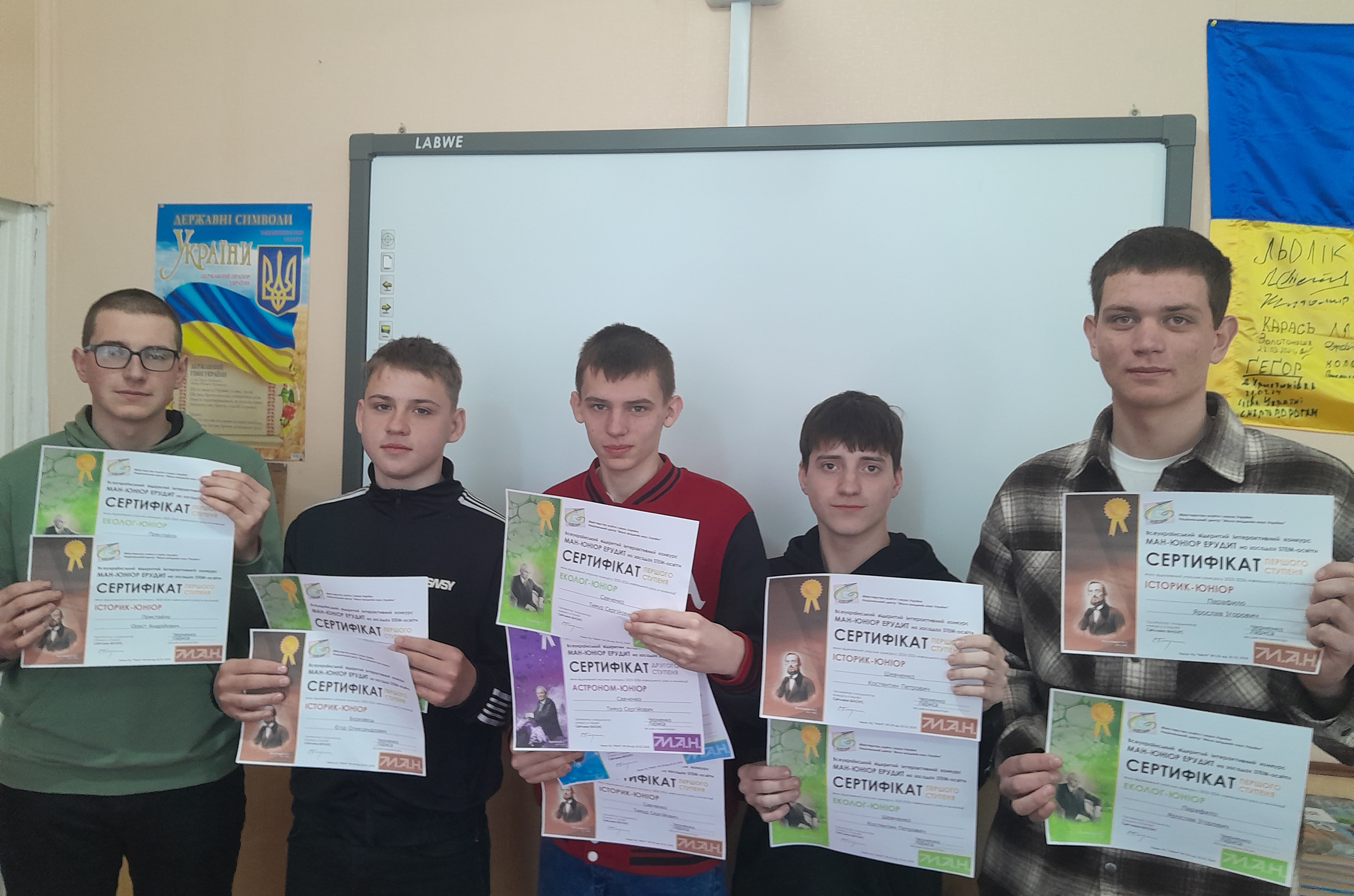 - в номінаціях «Еколог-Юніор» та «Історик-Юніор» – І місця здобули: Борківець Єгор, Парафило Ярослав, Підплета Анастасія, Пристайло Орест, Савченко Тимур, Шевченко Костянтин;